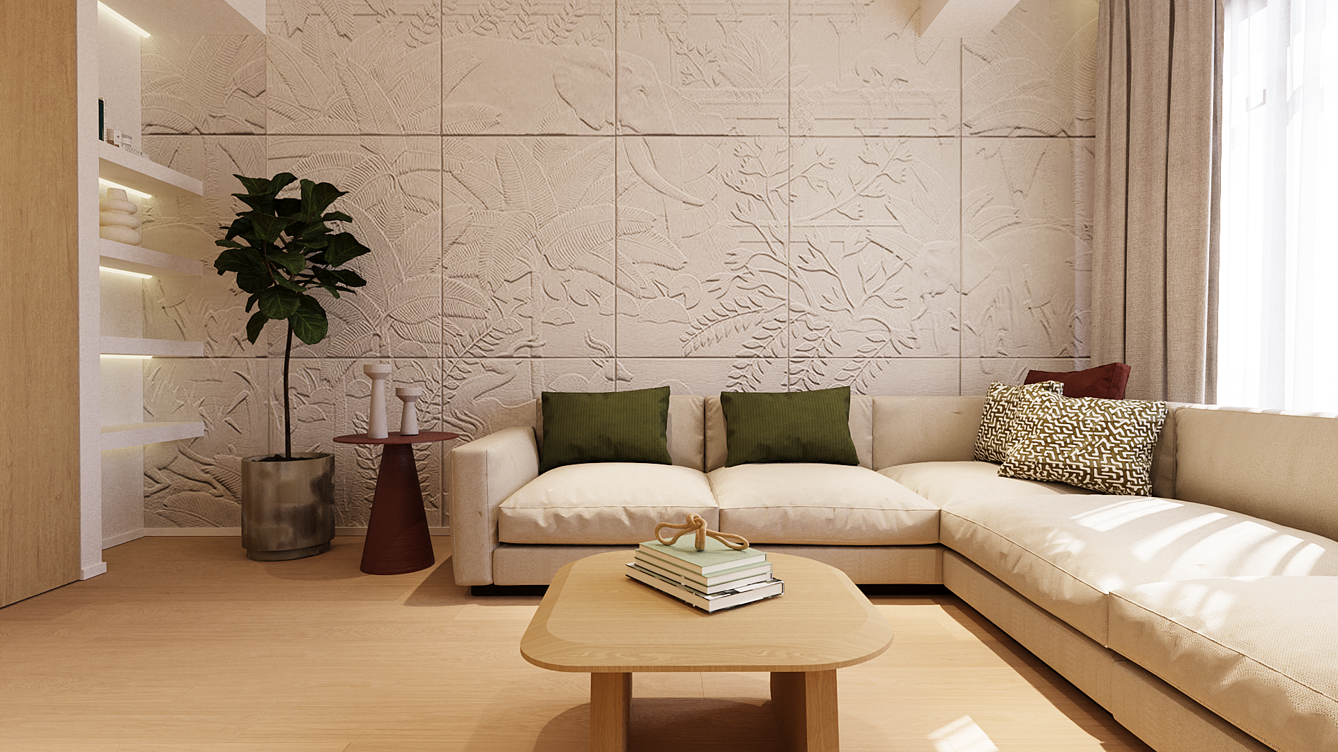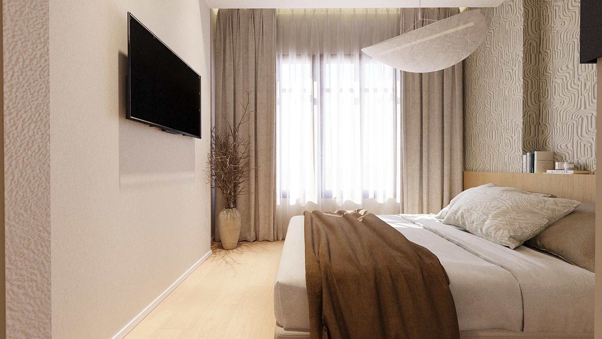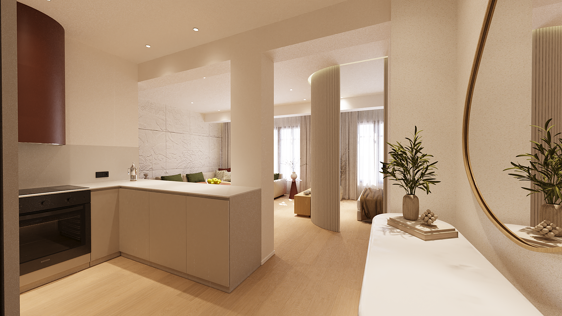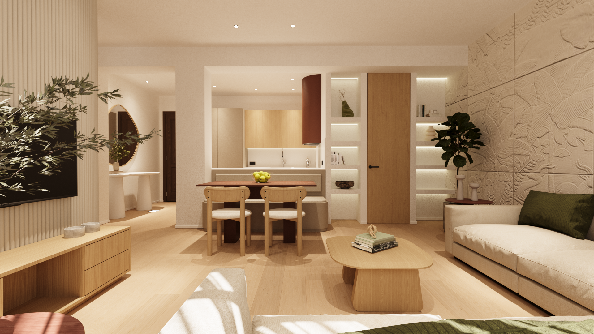 Los espacios se organizan de forma fluida, potenciando la entrada de luz natural y la conexión entre estancias. Los materiales neutros, la madera y los tonos suaves construyen una base atemporal, mientras que los detalles —texturas en paredes, piezas curvas y elementos integrados— aportan carácter y profundidad sin recargar el conjunto.